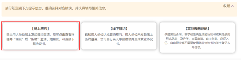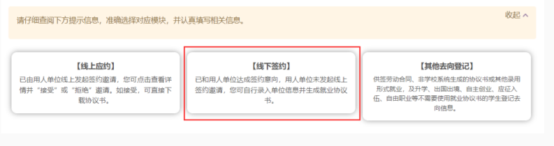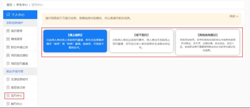 登录就业系统>进入签约中心,根据自己的情况选择以下三种模式签订就业协议书(线上签约、线下签约)或登记毕业去向信息(三选一):
