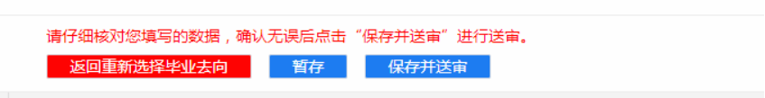 2.根据自己的去向情况,选择相应类别,填报信息,上传证明材料。确认信息无误后,点击“保存并送审”。