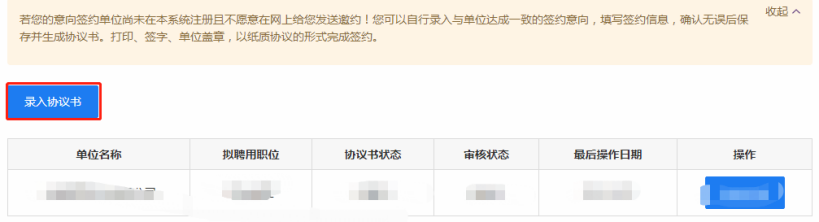 特别提醒:协议书一旦录入生成,签约流程不可单方面终止,如需改签单位,须办理解约手续,请一定谨慎思考,确定签约单位后再录入信息。