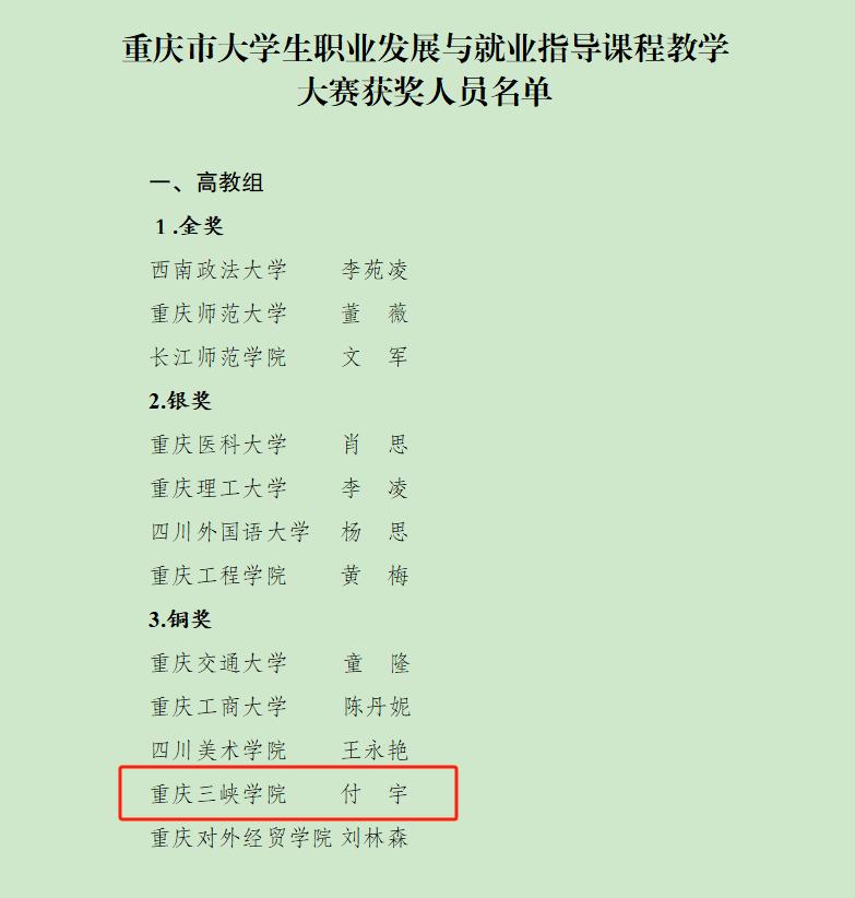 近日,由重庆市教委举办的大学生职业发展与就业指导课程教学大赛圆满结束。我校计算机科学与工程学院付宇老师荣获市级铜奖。此次大赛全市共有42所高校参与,经过校级初赛、市级复赛等环节层层选拔,评选出金奖4名、银奖6名和铜奖10名。