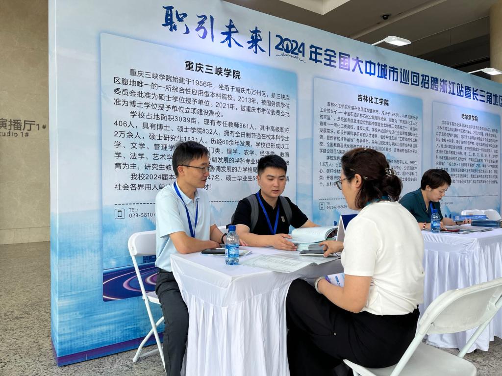 25日,2024年“职引未来·全国大中城市巡回招聘(浙江站)暨长三角地区青年人才交流会”在杭州召开。据悉,本次活动由人力资源和社会保障部全国人才流动中心、浙江省人力资源和社会保障厅共同主办,联合上海、江苏、安徽,组织三省一市重点企事业单位和高校共聚杭州,举办以青年人才交流为主题的区域性大型招聘活动。三省一市共组织企事业单位380余家,推出各类岗位4500余个,需求人数15000余人,涉及信息技术、机械制造、生物制药、能源化工等18个行业。在本次活动上,刘文菘一行积极与来自长三角地区近百家企业负责人进行洽谈,展示学校的办学特色、专业设置以及人才培养情况,并与30多家用人单位取得联系,初步达成合作意向。
